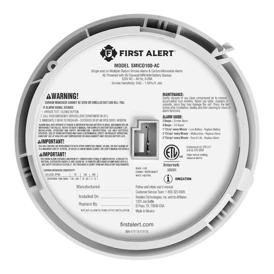 BRK SMICO100-AC, Hardwired, Combination Smoke & Carbon Monoxide Alarm, 9V Battery Backup, Ionization/Electrochemical Sensor, White